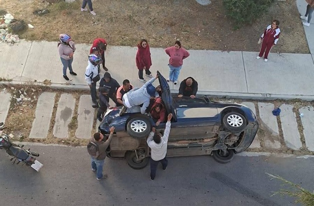 El choque y volcadura tuvo lugar en la intersección de las calles Río Mayo y Danubio, vecinos del lugar que se percataron del accidente auxiliaron a los ocupantes del auto volcado a quienes ayudaron a salir de la unidad.